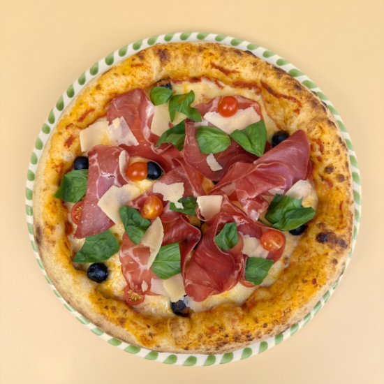 Sauce arrabbiata, mozzarella, tomates cerises, olives, copeaux de parmesan, coppa, huile d'olive, basilic