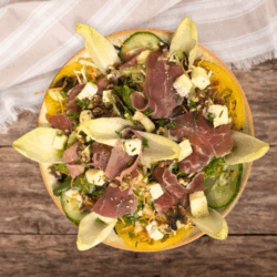 Salade, endives crues, JAMBON FUMÉ ou POULET, tomates cerises, brie AOP, noix